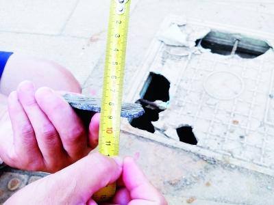 “是得有多脆的井盖才能碎成这样?”抓起其中一块碎片,刘先生发出感叹。他随即用卷尺丈量碎片的厚度。不知是为了保险还是感觉诧异,他反复丈量了几次。“薄的连我自己都不信”,他说——一块井盖最薄处竟只有4毫米,另一块稍厚,5毫米。“怎么量都没超过一厘米”。