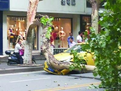 大梧桐突“断臂”砸烂出租车车头 或因灌雨腐烂所致