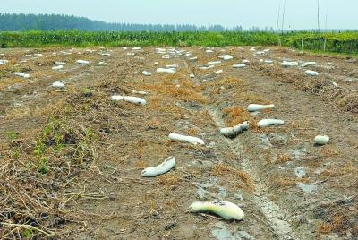 图为辛安渡农场袁家台村附近农田里,大量无人采摘的冬瓜烂在地里。