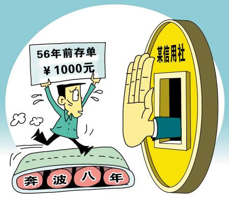 河北平山县陈家峪村孤寡老人陈兰平,持有父亲56年前存的1000元定期存单。8年前他到西柏坡信用社要求兑付,信用社方面称,时间太久了,找不到存根,兑付不了。8年来,体弱多病的陈兰平不知在省市县三级信用社之间来回奔波多少次,但至今仍无结果。(7月31日《燕赵晚报》)