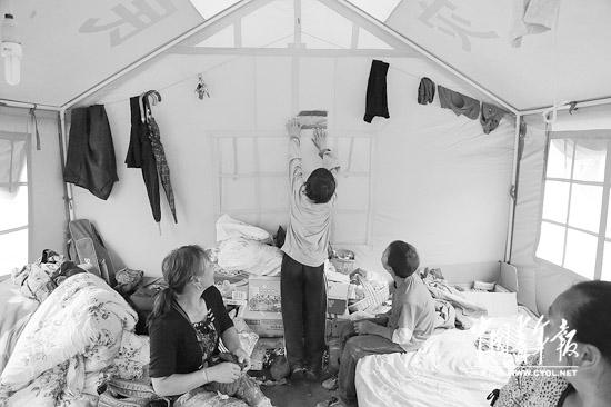 8月10日,云南鲁甸龙头山镇灾民安置点,12岁的陈大雄正往帐篷的墙壁上贴他自己画的一幅画——“晴天太阳”。他的父亲在地震中受重伤,目前还在昭通的一家医院接受治疗。本报记者 赵迪摄