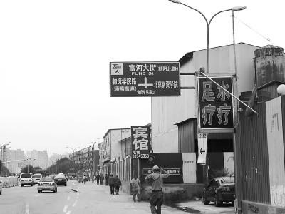 在通州区物资学院东侧,路边的施工围挡围起一片建设中的地铁6号线工地,在临街的围挡豁口墙上,分别挂着一个宾馆招牌和一个足疗店的灯箱,其中足疗店挂出的“足疗水疗”的灯箱用一根铁棍固定在围挡墙上,一根电线通到灯箱里面。一位施工人员说,这家足疗店就在旁边的居民楼里,但是牌子上指示的宾馆就不知道在哪里了。一位附近居民说,这段路一直在修地铁,大概有两三年时间了,因为施工路面交通秩序比较乱,到了晚上,路边的“前方施工 车辆慢行”的文字和警示灯就会闪烁起来,提醒司机减速慢行,但是路边的广告牌也来凑热闹,亮起来的灯箱很干扰司机的视线。