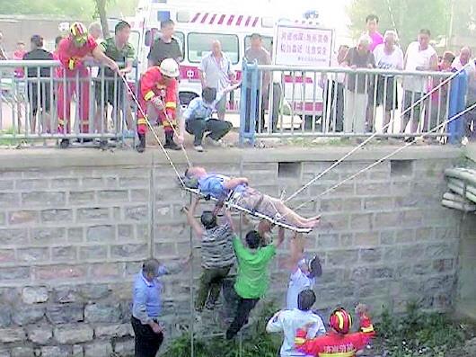 热心的群众拨打了110、120、119报警电话求救,同时通知杨先生家人。最后,在消防、民警、医护人员和热心群众的共同努力下,杨先生被固定在担架上,担架两端系上了绳子,大家一起发力,把他安全抬上了岸,送到医院治疗。(记者 张泰来 实习生 周国星)