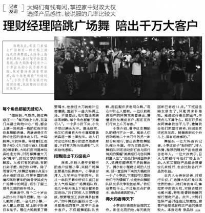 毕业不到两年,小季已成为某银行的客户经理,他的秘诀就是陪大妈跳广场舞:“一位以前做房地产的阿姨被我发展成客户,现在在我们行有上千万存款。”业内人士称,广场舞大妈是非常优质的客户,她们有钱有闲,掌控家中财权,对投资理财也感兴趣。本报这条新闻引起读者广泛讨论。