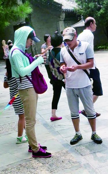 和游客搭讪时,这些人均声称自己有正规导游证。若游客接过话多问几句,他们就会一直纠缠不放,卖力“推销”自己。北宫门外兜售导游服务的人更多一些,他们一般单独行动,守在售票窗口前揽客,或者混入游客队伍中“游说”,甚至公然在公园讲解处前“抢活”。