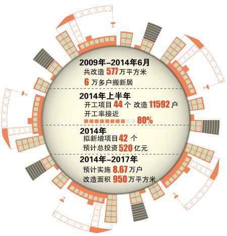 数据显示,2014年全市拟实施棚改项目56个14700户,截至6月底,已开工44个,改造11592户,开工率接近80%。