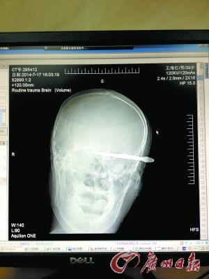 7月17日下午2时多,一名昏迷的壮年男子被民警送入广州市第一人民医院急诊科。在短发中,露一小段彩色的金属片状物,它的下端牢牢地插在左边太阳穴处。医生从民警处获悉,伤者中午被利器刺穿头颅。