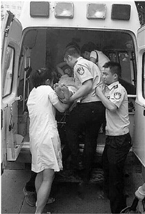 此时的罗女士已经筋疲力尽,脸色发白,民警帮着医护人员,将她抬上了救护车。