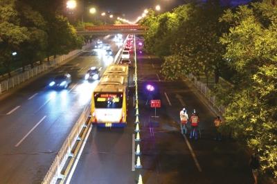 施工方公联公司负责人表示,主路路面修复目前已完工三分之二。为保持路面沥青完整,夜间施工时将拆除隔离带,给路面铺“新油”。其中大面积路面用了改性沥青,避免传统沥青“冬硬夏软”的缺点;公交道则使用专门抗车辙的混凝土,类似“强力除皱霜”。