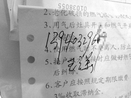 记者看到了这个写在一张收据背面的电话号码和名字。姓名是连笔字,很模糊,只能看清楚姓王,后面的字确实看不清楚。手机号码前9位很清晰:139403296,后两位有涂改的痕迹。