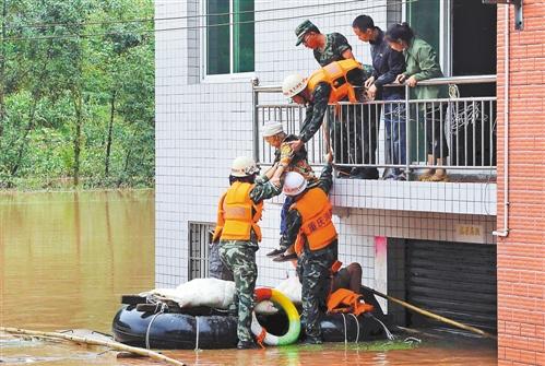八月十日晚的强降水,让綦江区石壕镇梨园村梨园坝八户农舍被淹,十八人被困。报警后,截至十一日上午十一点,被困人员全部被安全救出。图为救援人员现场施救。通讯员 杨翼德 彭伟 摄