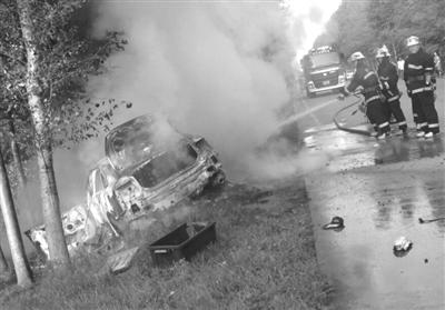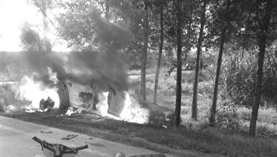 轿车与电动车相撞后撞树起火 车内驾驶员受伤(图)