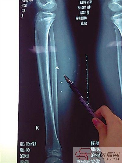 平平的小腿内异物清晰可见。