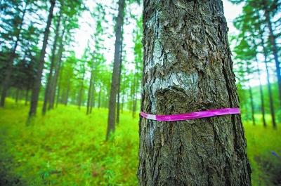 绑着红绳的就是目标树。每隔六七年,就伐掉妨碍目标树生长的残次树木,这样,目标树的胸径每年能比之前多长2.6厘米左右。本报记者 邓伟摄