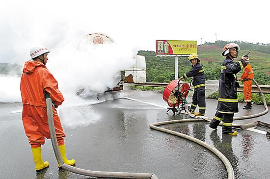 高速交警和路政部门、消防、安监等部门得到消息后紧急赶往现场。“当时,破损的槽罐车车厢尾部上方那个红色的‘爆’字,更是令人触目惊心,如不及时处置,难免会发生更大的灾难”,一位参与救援的交警说,当时浓浓的白烟不断从破损处涌出,事故现场已是白烟缭绕,并弥漫着浓烈刺鼻的气味。
