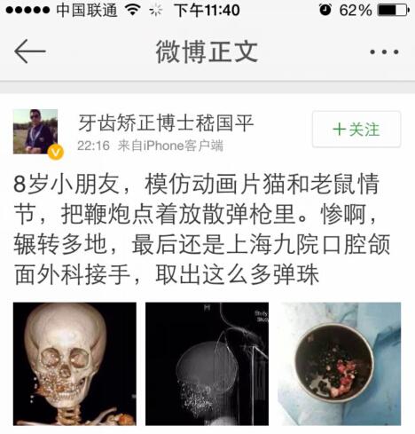 8月20日晚间,多位医生爆料称,一名来自安徽的男孩将鞭炮塞进霰弹枪管中玩耍,不料发生爆炸,钢珠全部炸在男孩脸上。据新浪微博认证为“上海交通大学附属第九人民医院医生”的用户称,男孩系模仿动画片《猫和老鼠》的情节,点燃鞭炮并放在霰弹枪内致严重受伤。最终,男孩被辗转多地,最终在上海第九人民医院实施手术,将钢珠取出。