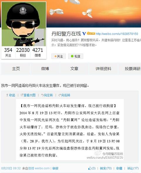 江苏一网民造谣称丹阳火车站发生爆炸 被警方拘留