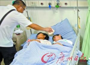 16号床位上一对母子挤在一起,女子脸色苍白。母亲范女士来自清远,他是暑假来广州看望妹妹。但没想到的是,自己母子和妹妹母女、以及哥哥家儿子,一共五人都被几块三明治“放倒”了。