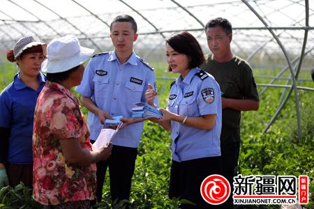 8月12日,在乌鲁木齐米东区三道坝镇三道坝村蔬菜大棚基地,米东区公安分局民警王宏(右)向村民们介绍遇到突发事件时如何处理。