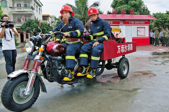 2007年,当地派出所的义务消防队员根据当地农村偏远路窄等特点,将机动三轮车改装成消防车,可以进村入巷扑灭初火。这种三轮车的取水管长约7米,可以在河涌直接吸水,抽水机出口连接消防水带对几十米以外的小型火灾进行灭火。