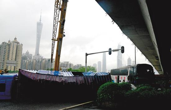 当时,一辆满载1500箱啤酒的蓝色货车自北向南行驶,突然一声巨响,被右侧开来的长途大巴撞上。货车滑行了近5米后,轰然向左侧翻,倒在了路中间,侧面的车门被撞飞。而长途大巴在撞上货车后,又直接冲上大桥底下的绿化带,狠狠地撞在猎德大桥的桥墩上。