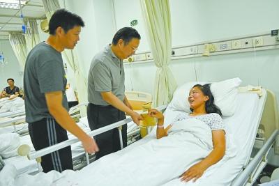 武汉公交集团公司总经理徐斌慰问被打女司机张桂(右一)。