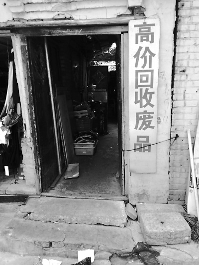 向军南里三巷的石路上,每走几步就可以看到一张用油漆写在木板上的“高价回收废品”牌子,斜靠在路边平房的门外,门有的关着,有的虽然开着里面也漆黑一片。个别牌子会特意标注上:“屋里有人”。二三百米的小巷子里,挤满了十几家小型废品收购店,每家店里空间十分窄小,不过二三十平方米大小,堆满了从钢铁到塑料瓶在内的各式废品,废品堆里塞着一张小床。