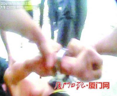 男子被戴上手铐控制。