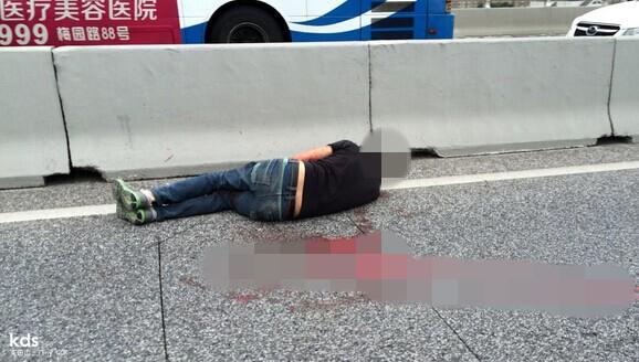 事发地点位于卢浦大桥浦西往浦东方向的主桥面路段,一辆沪H牌照的灰色大众途安停在临近中央隔离带的1号车道上,前挡风玻璃已经破碎。距离车辆不远处,一名身着黑色短袖、蓝色牛仔裤和运动鞋的男子侧躺在地,身边有大摊血迹,已经毫无动静。