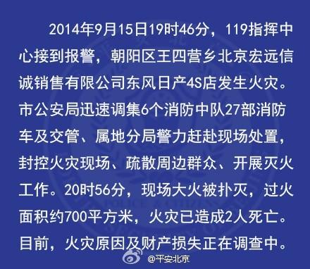 据北京市公安局官方微博通报,今日19时46分,朝阳区王四营乡北京宏远信诚汽车销售有限公司东风日产4S店发生火灾,火灾已造成2人死亡,过火面积约700平方米。目前,火灾原因及财产损失正在调查中。