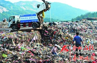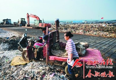 多雨季节的合肥,昨天下午天空中露出了难得的阳光。拾荒者们乘着这个好天气,到垃圾填埋场内多转一会。记者坐在电动三轮车上,阳光透过云层,光柱洒在肥东龙泉山上。蓝天之下,却是一个硕大无朋的垃圾填埋场,被黑色覆盖物遮住一半的垃圾坑,已被堆积如山的垃圾完全覆盖,各种斑驳的颜色交杂在龙泉山的大坑上,让人作呕的刺鼻气味,无时无刻不在刺激着人的鼻腔。