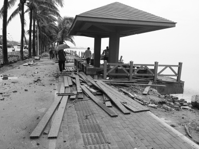 昨日,记者在滨海大道永万路以西路段看到,环卫工人在洒水车的配合下,清洗路面淤泥。园林部门在海边修建的凉亭和栈道等损毁严重,栈道上的部分木板被冲走,因部分路段地基出现坍塌,凉亭处于半悬空状态。