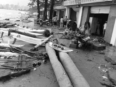 在假日海滩景区,许多椰子树被吹倒,从草坪到海滩区域,随处可见塑料袋、矿泉水瓶等垃圾,靠近海边的一些小木屋和小卖铺,被海水冲得不知去向。“这次损失非常严重,我们这里有5处营业点被冲走。”正在忙碌的景区工作人员宋先生说,景区共有1700米长的栈道和椰林道坍塌,120多棵树被刮倒,海边的排水系统和照明管线损坏,“目前景区基本上处于瘫痪状态,最少要5至10个工作日才能逐渐恢复营业。”