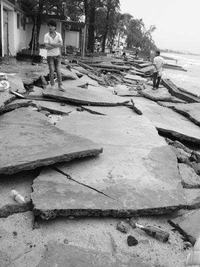 “‘威马逊’过后,我们这里只是有些积水,这次店内的东西都被冲走了。”在该步行街经营水吧的熊女士告诉记者,台风来临前,店铺的门是锁着的,但潮水涨得太厉害,海潮摧毁防洪堤后,卷起巨大的水泥块等,砸坏了卷帘门,店内物品几乎被“掏”空,损失惨重。