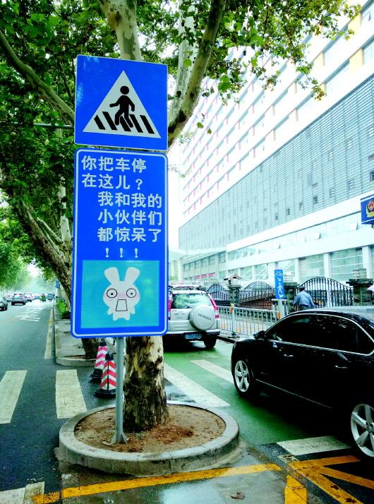在众多指示牌中,最引人注目的还是两块网络用语写成的卖萌指示牌。其中一块位于等待进入停车场的通道北侧,上面写着“待你乘客落地,行车让道可好?”,另外一块位于齐鲁医院综合警务室门口的路旁,这里是医院急救车的入口,树上牌子上写着:“你把车停在这儿?我和我的小伙伴们都惊呆了!!!”标语下面还有一只瞪大眼睛张着嘴巴的小兔子,看起来真是萌翻了。