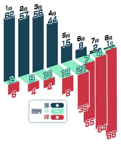 发布的数据显示,8月份70个大中城市中,新建商品住宅和二手住宅价格环比上涨的城市个数均为1个,下降的城市个数分别为68个和67个。