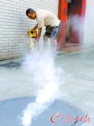 工作人员用烟雾机烟熏灭蚊。 记者于涛摄