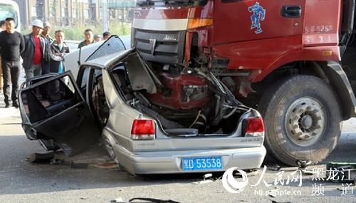 哈尔滨一翻斗车与捷达轿车相撞 致2死2伤(图)