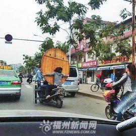 网曝福州惊险行驶照:女子抱圆桌坐电动车(图)