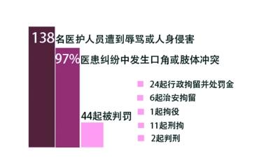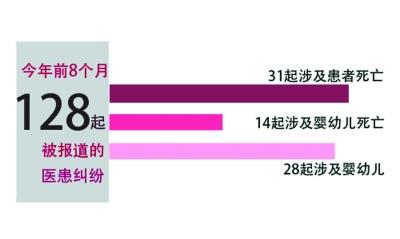 2014年前八个月,全国范围内经过媒体公开报道的医患纠纷有128起,逾九成发生了对医护人员的人身侵害行为,涉及医护人员138名,因患者、患者家属对诊断或诊疗结果不满意而发生的医患纠纷占一半。