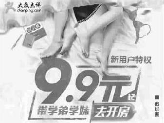 记者在手机上打开“大众点评网”,一眼看到四条裸露的腿,点开广告后,巨大的“9.9元起,带学弟学妹去开房”广告映入眼帘,图片上是4条裸露的腿、皱巴巴的床单、女性内衣文胸、玫瑰花瓣等图案,左侧还有一本“四六级”书。记者往下拉页面,发现是一则低价团购酒店房间的广告,参加的大多为经济型连锁酒店。