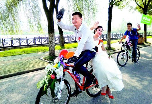 22日是世界无车日。昨天,鄂州市一位中学老师借用一百辆自行车迎娶新娘。人们称赞这对新人创意新颖、生态环保。 (视界网 姜夏东 摄)