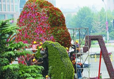 昨天,工作人员在长安街东单路口东北角搭建“歌唱祖国”大型景观花坛。国庆节临近,长安街沿线十处立体花坛的码放工作已全面展开,预计二十五日完成施工,进入养护期。 本报记者 孙戉摄