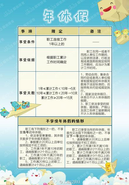 参与互动(0)十一长假即将来临,一些市民筹划使用年休假和公休假“拼假”外出游玩。你享受年休假吗?依据是什么?今天,上海市人力资源和社会保障局官方微博@上海12333 详解年休假制度,提醒市民,5种情况不能享受当年年休假,另外,职工依法享受探亲假、婚丧假、产假以及因工伤停薪留职期间不计入年休假假期。