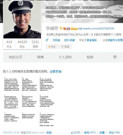 微博认证为“成都市公安局政治部宣传处民警、民警教育训练教官”的“李威佟”微博截图