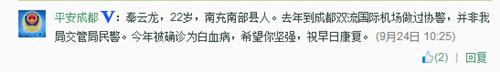 近日,有关“成都最帅交警患白血病”的消息引发众网民关注。昨日,经成都警方和当事人秦云龙确认,此前他曾任职成都双流国际机场协警,并非成都交警,确实于今年7月患病。在看到秦云龙的微博账号“秦思瀚”发布的努力抗击病魔的信息后,众网民纷纷留言鼓励祝福。