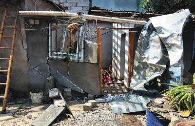 事故地位于晋安沁园支路边上一个小院里,四周分布多间砖瓦结构的民房,其中发生意外的小屋面积不到20平方米。昨日中午,记者一走进小院,隐约还能闻到一股味道,现场一片狼藉,最严重的当属传出爆炸声的小屋,一堵大约10厘米厚的水泥墙体多处开裂,一侧墙体由内向外倾斜,部分墙体倒塌,民房的铁皮屋顶和瓦片被震飞落到一旁。