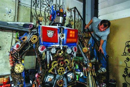 重达几百斤的废铜烂铁,堆积在一起有半人多高,里面的零件碎片五花八门。刘波挑选出几块体积较大、较平整的铁片以及助动车、自行车的齿轮等,焊接出了“擎天柱”的躯干,然后又将一些废弃的防盗门锁、助动车的减震器、链条等物,焊接出了“擎天柱”的四肢。最后一项是“擎天柱”的头部,也是最难的一个部分,刘波发现剩下的材料中有十多个报废的防盗门把手,于是灵机一动将这些把手切割、打磨后,再焊接成一个近似圆柱体的“头部”。