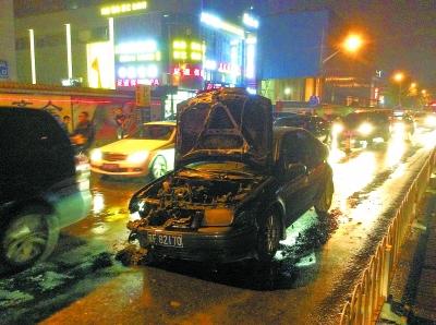 昨晚8时20分许,蒲黄榆路口东侧,一辆大众牌小轿车突然发生自燃。独自驾车的中年女司机发现着火后立刻下车,并未受伤。轿车前部受损严重,右前轮爆胎。消防员赶到后将火扑灭。自燃造成该路段拥堵约1小时,晚9点多轿车被拖走后交通逐渐恢复。