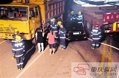 10月7日晚,江北区大石坝壹江城附近,大货车与路边停靠的渣土车发生碰撞,中间还夹着小轿车。重庆晨报记者 苑铁力 通讯员 龚清亮 摄